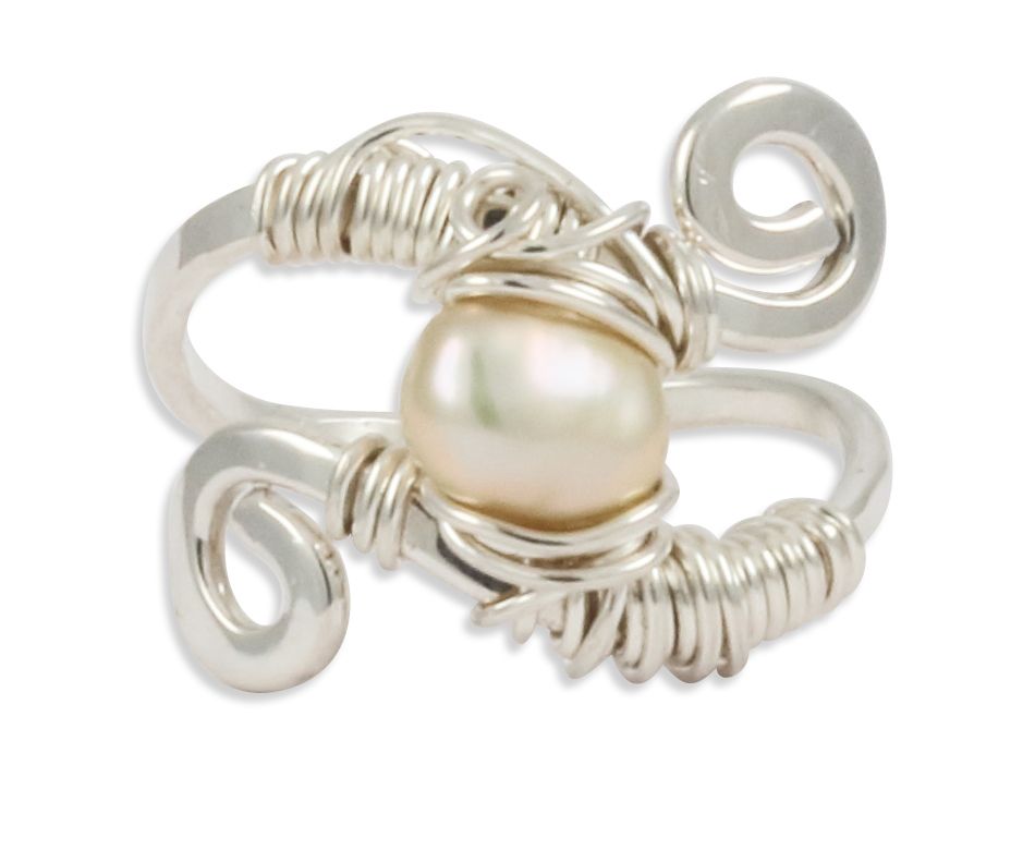 Liz has fashioned her signature curlicue from sterling silver 14-guage wire into a classic Baroque-style ring that will complement any hand it adorns. She's wrapped sterling silver 22-guage wire around the base and mounted a freshwater champagne pearl to complete this one-of-kind beauty.