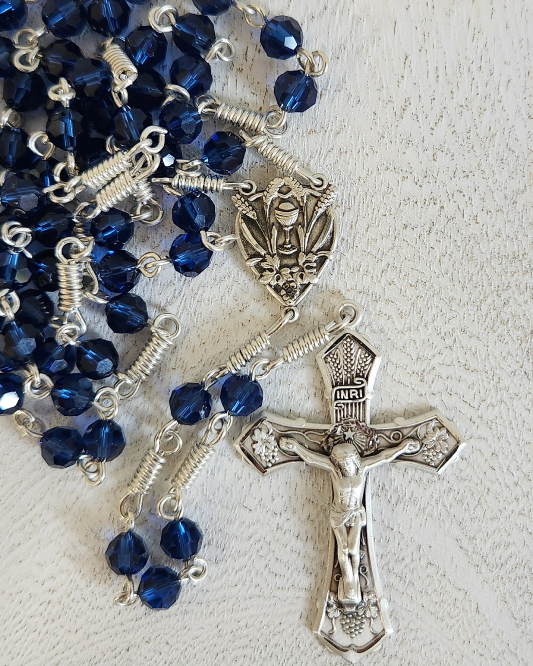 Stunning blue rosary handmade with sterling silver crucifix and depicts a detailed chalice centerpiece. The medal represents the covenant between God and humanity, echoing the Last Supper and Christ's sacrifice