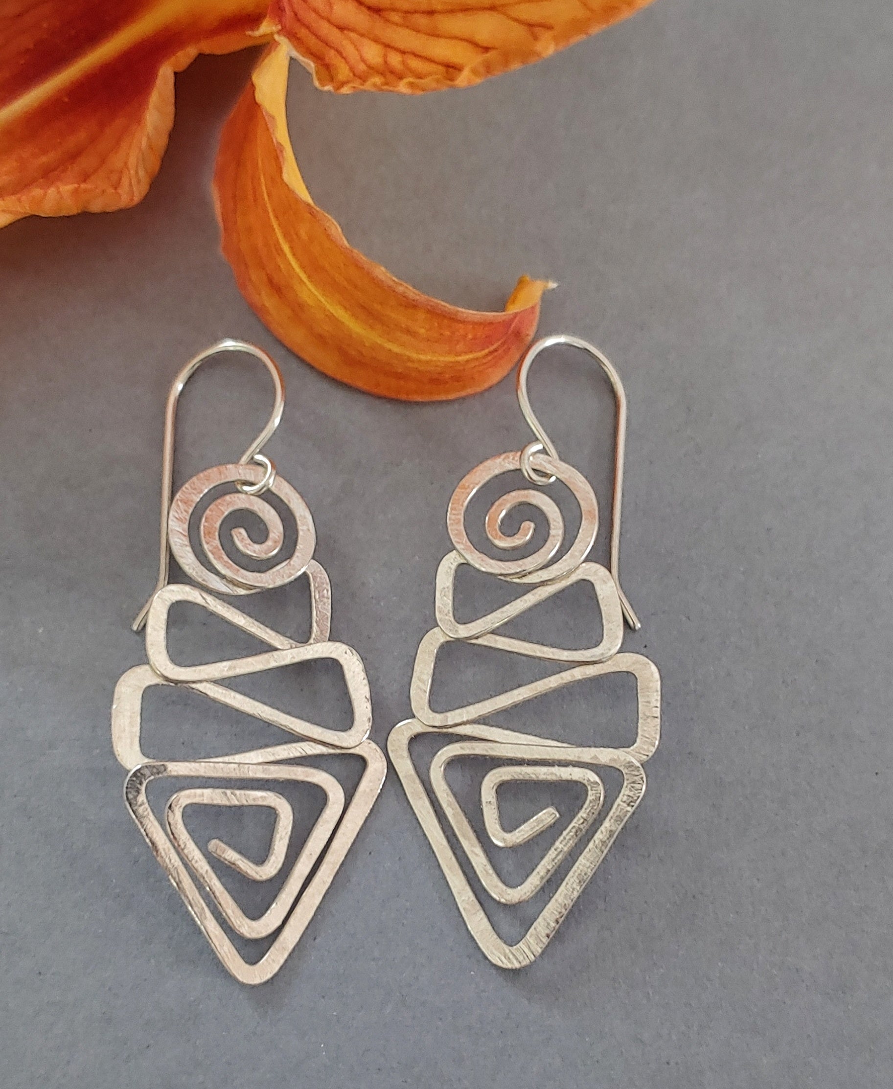 This design is constructed of 16-guage sterling silver wire at 1-1/2 inches in length. Liz’s signature curlicue starts off the design that flourishes downward in a bold geometric pattern that’s been textured and polished. This is the pair to wear with your power outfit for that next board meeting you lead, or when you go in to ask your boss for that raise you so deserve! At $40, this investment will be your talisman for all your adventures, challenges, and new beginnings.