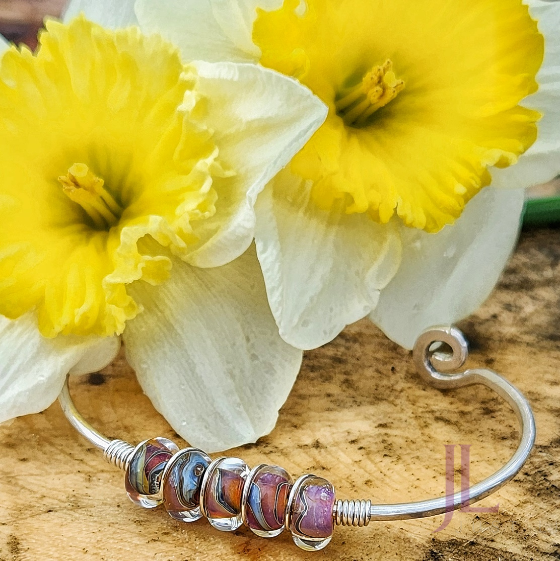 This cuff bracelet is an explosion of artistry- sterling silver skillfully shaped into a playful and ergonomic shape, adorning five stunning lampworked glass beads.