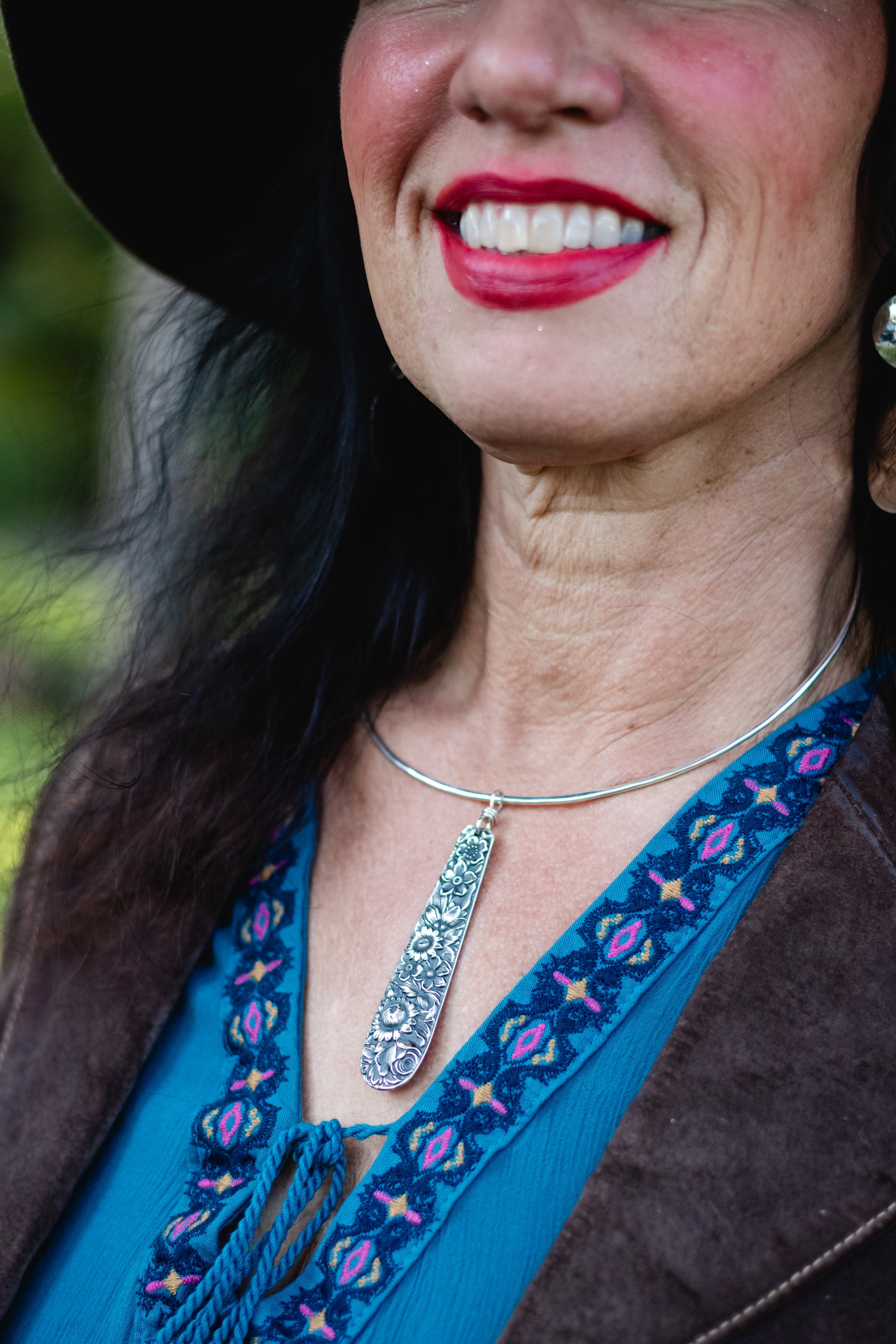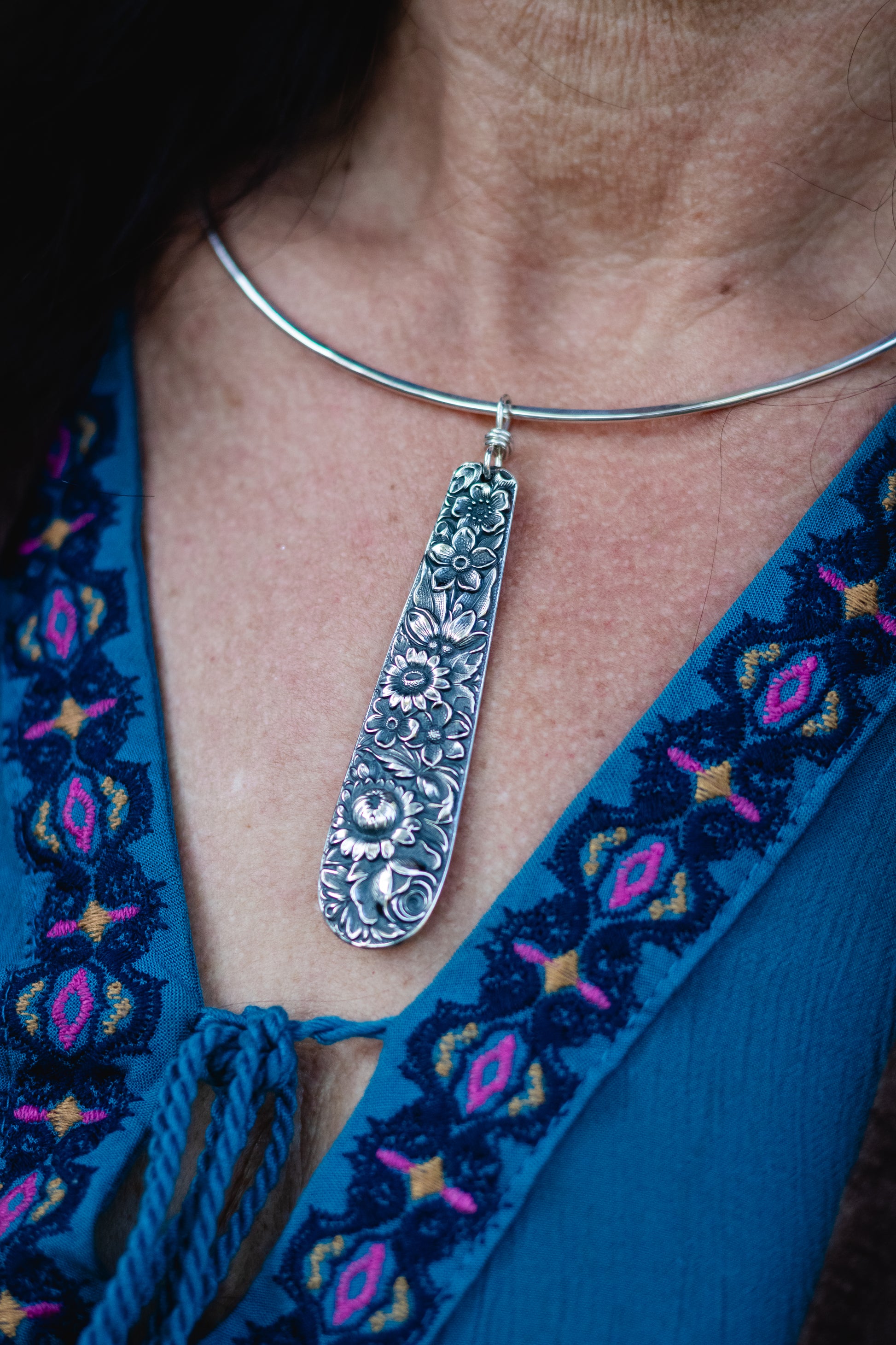 Floral Silver Spoon Pendant Necklace (Repousse Pattern, One of a Kind)