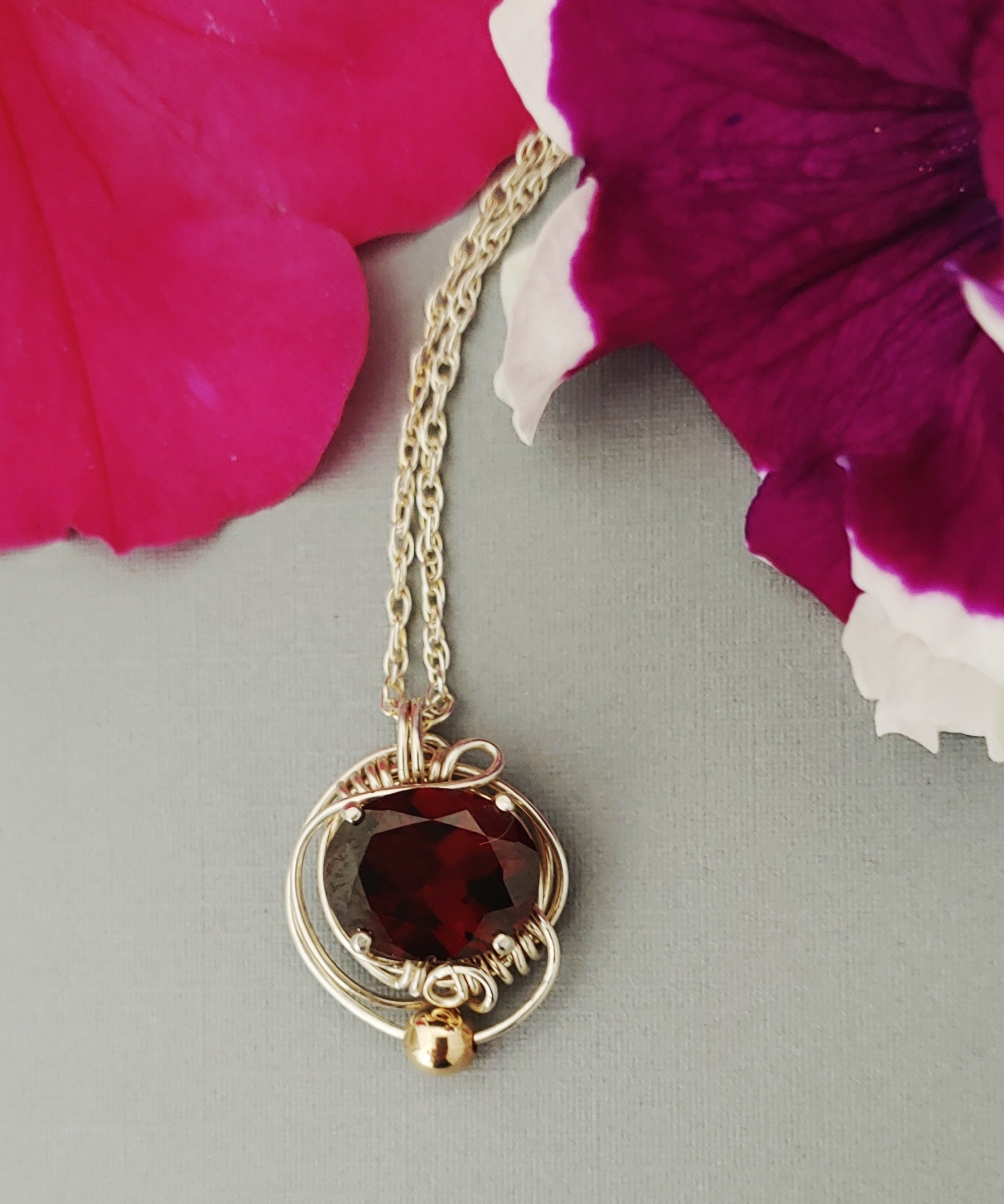 Sterling silver wire carefully encases a classic 10X12 oval garnet complete with 4mm gold-filled bead accents. This statement piece is sure to get notice! Try wearing it on a sterling or gold choker for a special night out or match with a box chain link 18” necklace to set off that new sheath dress you bought for the office.
