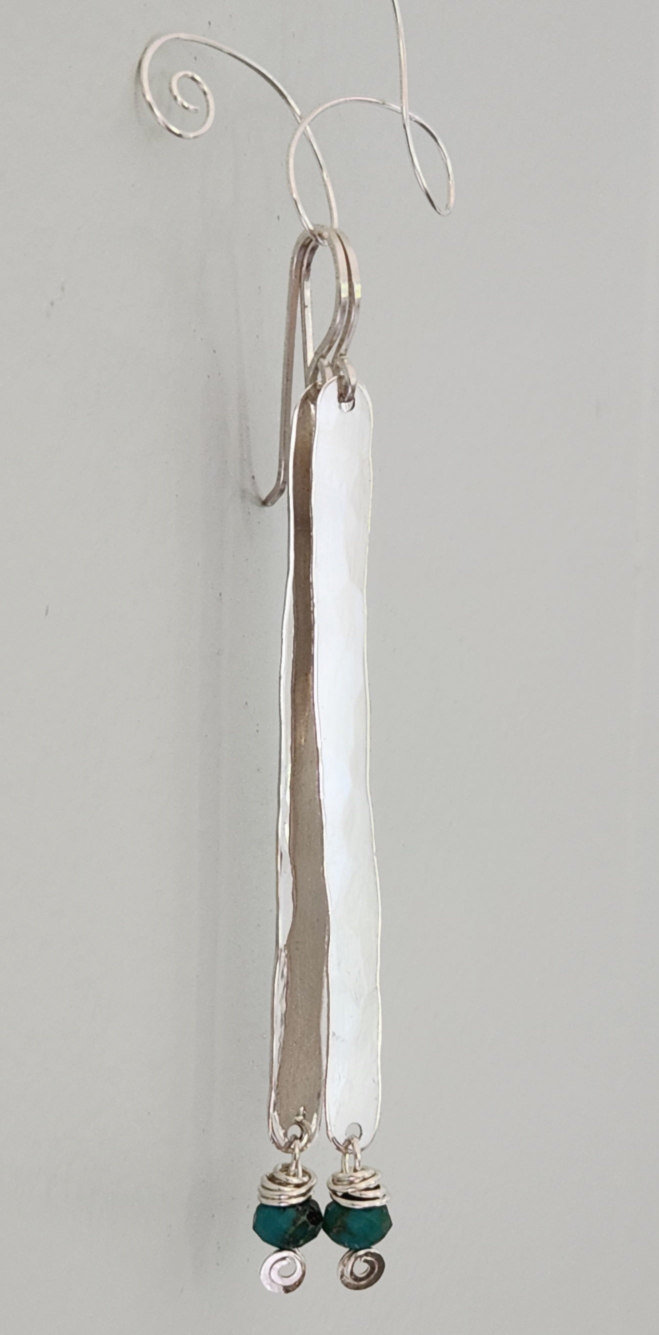 These hammered sterling silver earrings stop the show with a 3" drop. The sterling silver compliments the color of the stone beautifully. These dangle earrings are a versatile piece and can be worn to the office or out on a date!