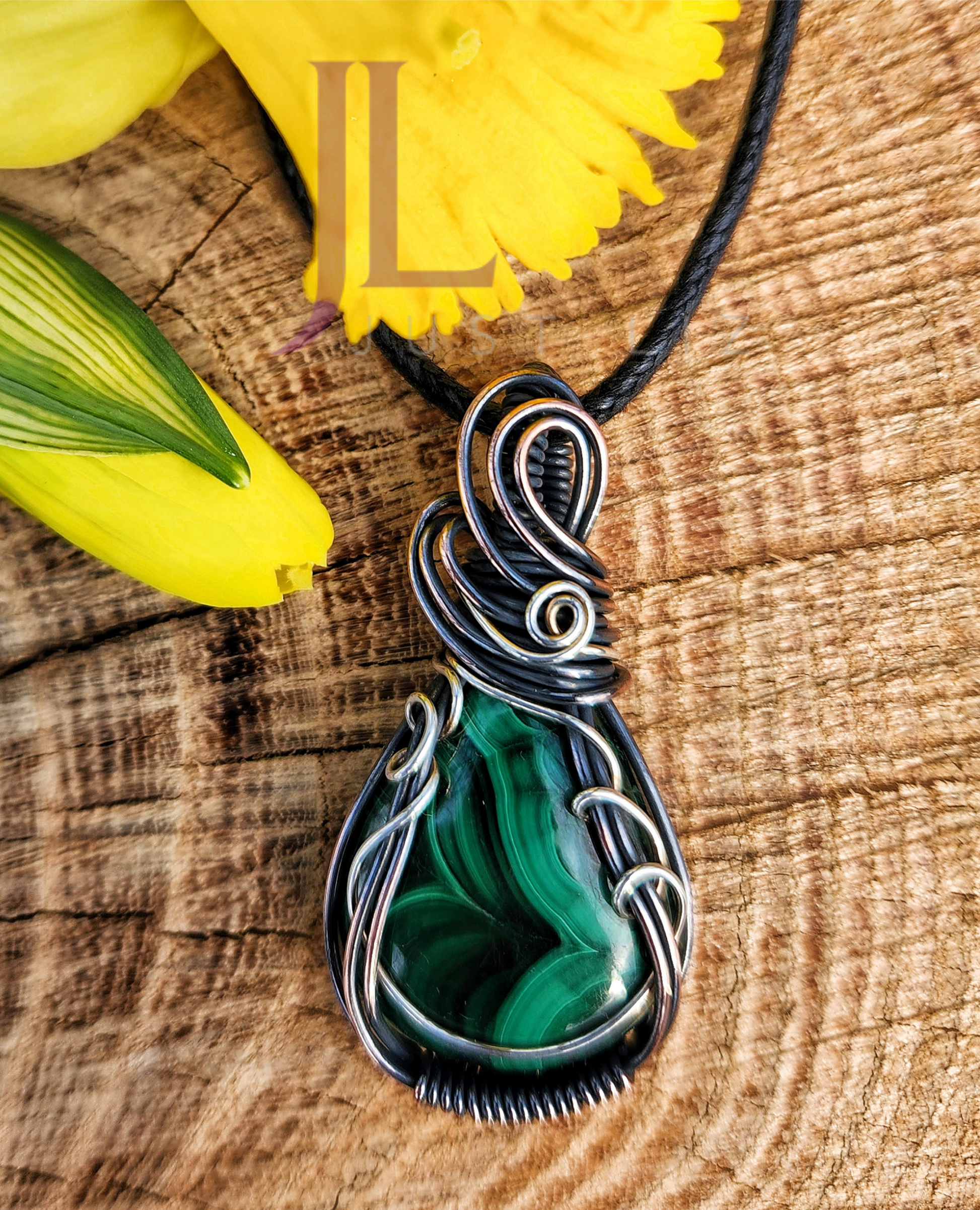 Say hello to spring with the exquisite Malacite teardrop pendant. With its striking green banding and whimsically wrapped copper and sterling silver encasement, this piece is perfect to brighten up your wardrobe in preparation for warmer days ahead.