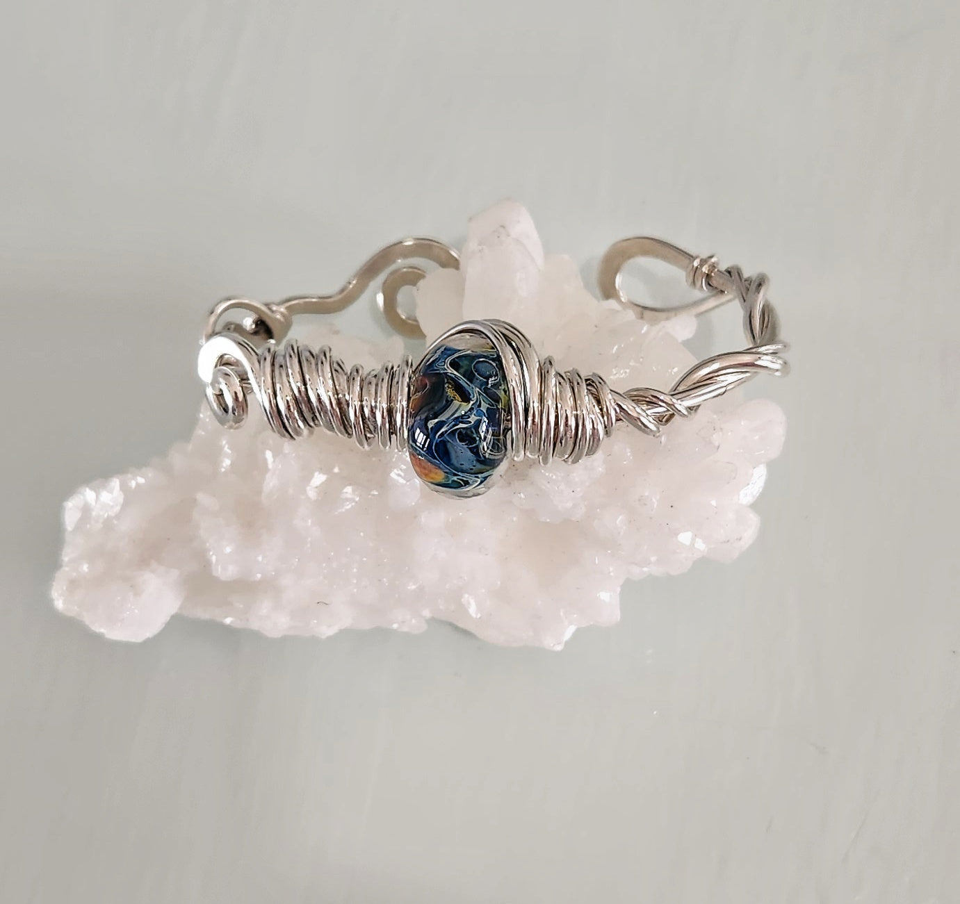 Fall in love with this gorgeous lamp worked glass bead spunkily wrapped in sterling silver. This bracelet is beautifully unique. Like all of our pieces, this is hand-crafted with a great deal of care and skill. You can be sure this new favorite is both high quality and lovely.